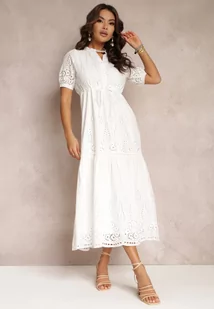 Biała Haftowana Sukienka Bawełniana ze Ściągaczem w Talii Ineryna