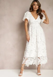 Biała Sukienka Koronkowa z Krótkim Bufiastym Rękawem Ulessa