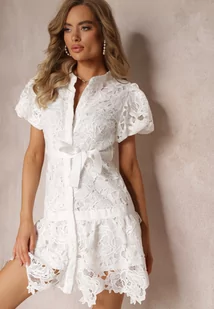 Biała Koszulowa Sukienka Mini z Koronkowej Tkaniny i Materiałowym Paskiem Sumelli