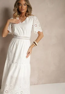 Biała Bawełniana Sukienka Boho o Rozkloszowanym Kroju Zdobiona Haftem Efrissea
