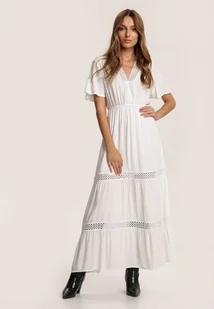 Sukienka Ilythyrra ze ściągaczem podkreślającym zwężenie w talii, o długości midi. Z krótkimi rękawkami oraz dekoltem w kształcie trójkąta. Ozdobiona wstawkami z koronki w pasującym kolorze, która delikatnie odsłania ciało. Wykonana z tkaniny. Szukasz prostej sukienki z akcentem boho$55 Model Ilythyrra będzie strzałem w dziesiątkę! Gumka w pasie mierzy po rozciągnięciu: