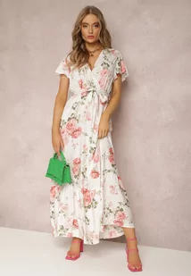 Biała Sukienka w Kwiaty o Kopertowym Kroju z Wiązanym Paskiem Iphene