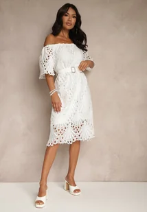 Biała Ażurowa Sukienka z Bawełną i Paskiem z Klamrą Mimixa