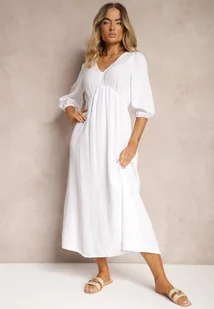 Biała Sukienka z Bawełny Ozdobiona Wiązaniem i Gumką w Pasie Wlarina