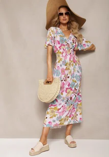 Biało-Różowa Sukienka w Kwiaty z Kopertowym Dekoltem i Gumkami w Pasie Lomanda