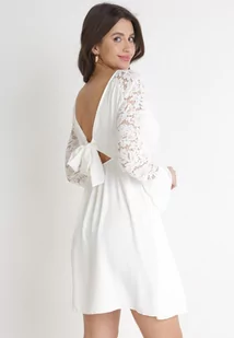 Biała Sukienka z Koronkowymi Rękawami i Gumką z Wiązaniem w Talii Vubatia