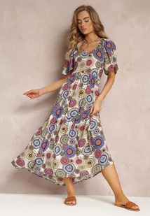 Biało-Granatowa Wiskozowa Sukienka Maxi w Kwiaty z Rozkloszowanym Dołem i Falbanką Pathna