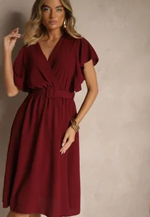 Bordowa Sukienka z Kopertowym Dekoltem i Paskiem Sizuee