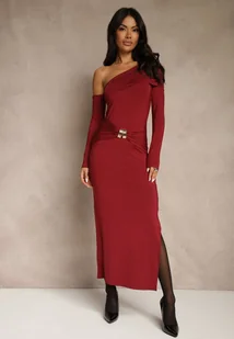 Bordowa Sukienka z Wiskozą Aplikacją Marszczeniem i Wywiniętym Dekoltem Reilenna