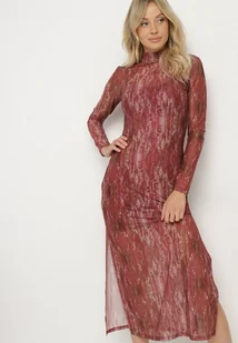 Bordowa Transparentna Sukienka z Wiskozą Półgolfem i Halką Vertilena