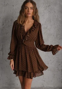 Brązowa Rozkloszowana Sukienka z Siateczki w Groszki z Falbankami Nesiba