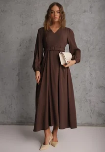 Brązowa Wiskozowa Sukienka o Rozkloszowanym Kroju z Paskiem z Klamerką Arilesse