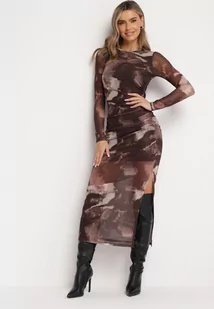Brązowa Siateczkowa Sukienka Maxi z Marszczeniem i Rozcięciem Valpuri