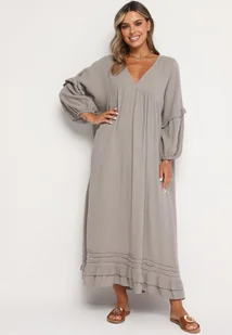Ciemnobeżowa Bawełniana Muślinowa Sukienka Ozdobiona Falbanką Perisea