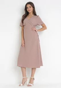 Ciemnobeżowa Kopertowa Sukienka Midi z Materiałowym Paskiem Rahellitte