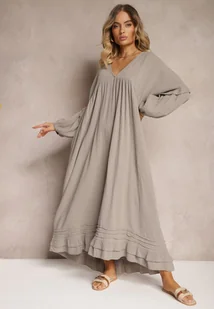 Ciemnobeżowa Bawełniana Muślinowa Sukienka Ozdobiona Falbanką Perisea