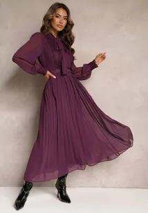Ciemnofioletowa Plisowana Sukienka Maxi z Koronką i Paskiem Venila