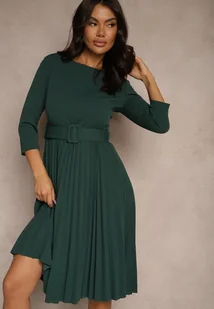 Ciemnozielona Plisowana Sukienka o Rozkloszowanym Kroju z Paskiem z Klamrą Annathiel