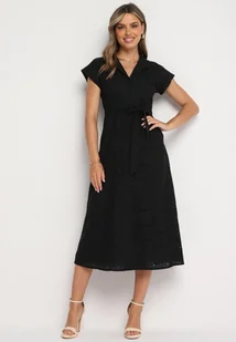 Czarna Bawełniana Ażurowa Sukienka na Guziki o Koszulowym Kroju Wiązana Paskiem Grosofia