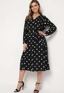 Czarna Wiskozowa Sukienka o Koszulowym Fasonie w Kropki z Paskiem i Kieszeniami Liliea