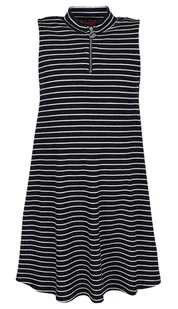 Czarna, prążkowana sukienka w białe paski. Wykonana z miękkiego, miłego w dotyku materiału. Trapezowa, posiada zameczek pod szyją ułatwiający zakładanie. Skł...