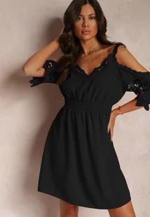 Czarna Rozkloszowana Sukienka Mini z Gumką w Talii i Hiszpańskimi Rękawami z Koronką Carolta