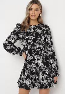 Czarna Rozkloszowana Sukienka w Kwiaty z Falbankami i Gumką w Pasie Navitiss