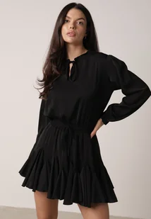 Czarna Rozkloszowana Sukienka z Wiskozą Zdobiona Falbanami i Wiązaniem Lerienatia