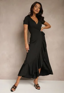 Czarna Sukienka o Kopertowym Fasonie z Falbankami Zleffia