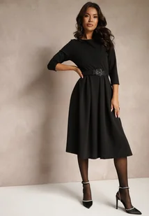 Czarna Rozkloszowana Sukienka Ozdobiona Przeszyciami Reamira
