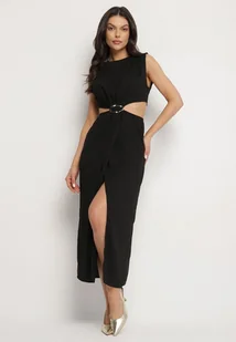 Czarna Sukienka Rozkloszowana z Wycięciami w Talii z Metaliczną Ozdobą Galetia