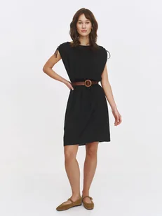 Sukienka damska Top Secret z efektownym ściągaczem na ramionach. Ceniona za swój niecodzienny styl sukienka damska o pełnym luzu i swobody kroju oraz długości przed kolano. Jest ona wersji bez rękawów, posiadając szerokie grube ramiączka, na których znajdują się efektowne ściągacze z cienkiego sznurka. Uroku dodaje jej efektowny owalny dekolt oraz wykonanie z przyjemnej w dotyku oraz przewiewnej tkaniny wiskozowej. Została ona wzbogacona o szeroki pasek, który założony w talii, podkreśla smukłość kobiecej sylwetki.