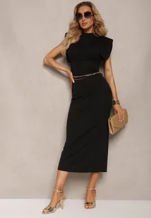 Czarna Taliowana Sukienka z Rozcięciem i Poduszkami na Ramionach Melloretta