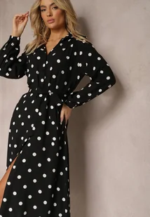 Czarna Wiskozowa Sukienka o Koszulowym Fasonie w Kropki z Paskiem i Kieszeniami Liliea