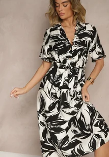 Czarno-Biała Koszulowa Sukienka z Wiskozy z Wiązanym Paskiem Ullosaria