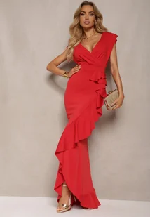 Czerwona Elegancka Sukienka Długa o Asymetrycznym Fasonie z Dekoltem w V i Falbaną Efimea