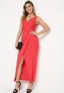Czerwona Klasyczna Kopertowa Sukienka Koktajlowa bez Rękawów Widoksa