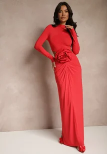 Czerwona Koktajlowa Sukienka z Wiskozą Ozdobiona Kwiatem 3D i Wycięciami Hannith