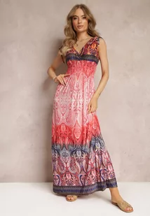 Czerwona Rozkloszowana Sukienka Maxi z Cienkimi Gumkami w Pasie i Kopertowym Dekoltem Clothilda