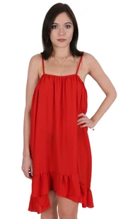 Zwiewna, czerwona sukienka na ramiączkach. Na dole asymetryczna falbanka. Z tyłu wiązanie regulujące szerokość sukienki. Wykonana z lekkiego, miłego w dotyku...