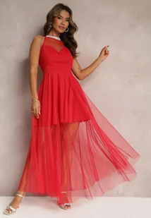 Czerwona Rozkloszowana Sukienka Maxi z Tiulem i Cyrkoniami Lilianie