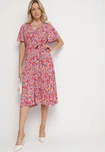 Czerwona Rozkloszowana Sukienka w Kwiaty z Kopertowym Dekoltem Plisowana Lanasira