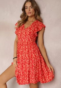 Czerwona Sukienka Mini z Wiskozy z Falbanką Przy Ramionach i na Dole Jaysing