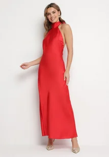 Czerwona Satynowa Sukienka Koktajlowa z Dekoltem Halter Annela