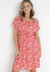 Czerwona Sukienka z Wiskozy w Kwiaty i Gumką w Pasie Alixeme