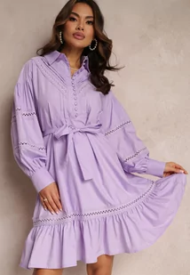 Fioletowa Koszulowa Sukienka z Bufiastym Rękawem i Ażurowymi Wstawkami Staples