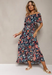 Granatowo-Różowa Sukienka z Hiszpańskim Dekoltem z Wiązanym Paskiem w Kwiaty z Bawełny Rissanique