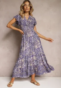 Granatowa Bawełniana Sukienka Paisley z Kopertowym Dekoltem z Falbaną i Gumką w Talii Brionea
