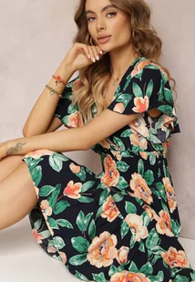 Granatowa Rozkloszowana Sukienka Maxi z Gumkami w Talii i Falbankami Tayte