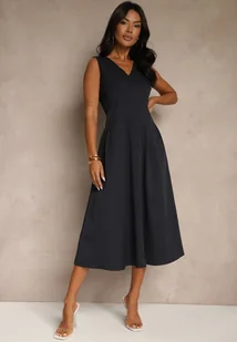 Granatowa Sukienka o Rozkloszowanym Kroju z Dekoltem w Serek Alifia